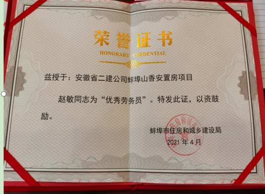 會(huì)議宣讀了市住建局《關(guān)于表彰勞務(wù)用工管理先進(jìn)單位和優(yōu)秀勞務(wù)員的決定》,安徽二建一分公司蚌埠山香安置房EPC 項(xiàng)目勞資專管員趙敏亦榮獲蚌埠市住房和城鄉(xiāng)建設(shè)局頒發(fā)的“優(yōu)秀勞務(wù)員”榮譽(yù)稱號。